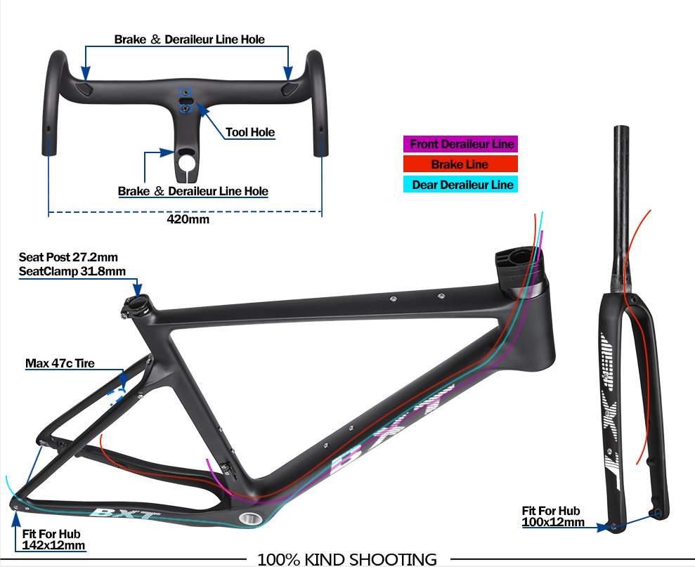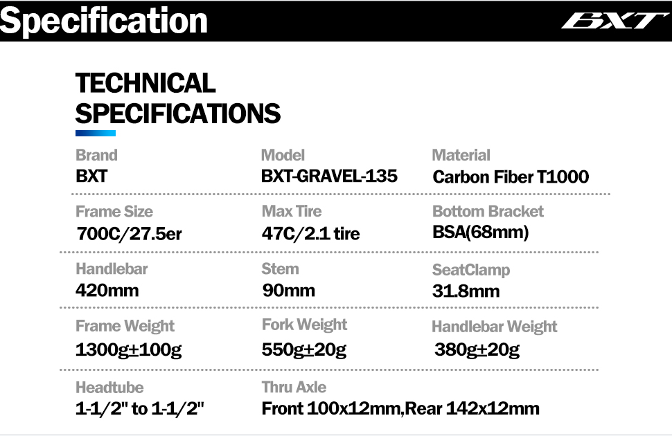 High modulus carbon fiber explore gravel bike frame.Compatible 47C tire.It’s built for all-day rides at high speeds over rough roads, trails, and thick gravel,while keeping the frame stiff and nimble for efficient power transfer and precise handling.